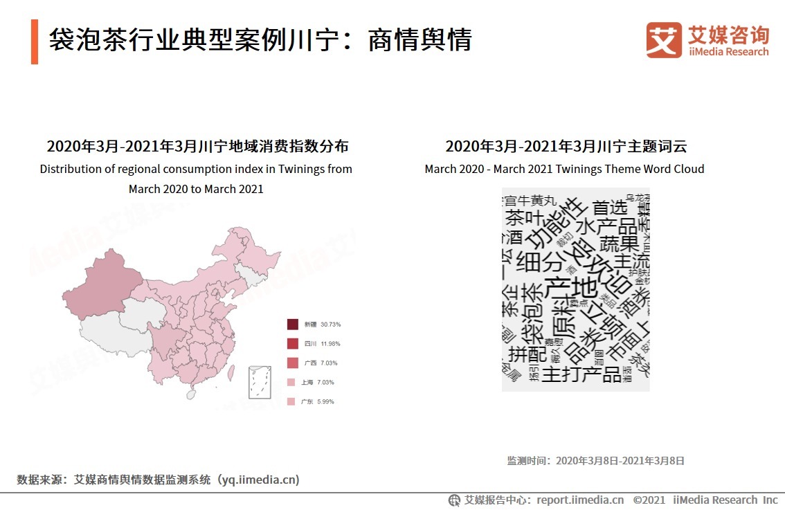 艾媒商业景气舆情数据监测系统显示,川宁当前消费用户主要分布在西北地区,新疆大本营是主要消费市场,占比30.73%。 2020年3月至2021年3月,川宁主题词云主要围绕“茶”、“流行”、“茶包”、“立顿”等展开。