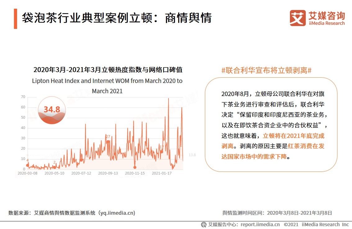 数据显示,立顿过去一年的网络热度总体在100以下,但一直保持缓慢上升的趋势。从在线口碑来看,口碑值为34.8,为负值。艾媒咨询分析师认为,自2012年立顿曝出“农药过量”、陈茶“大规模”等茶叶问题,以及新茶饮料和凉茶等竞品入局后,立顿红茶销量大增。和市场影响力都在逐年下降,这使得立顿的母公司联合利华在 2020 年 8 月宣布将在 2021 年底剥离立顿品牌。 但作为一个拥有 130 多年历史的品牌,立顿仍然拥有在品牌知名度、产品生产经营等方面具有极大优势。因此,扭转品牌老化趋势,迎合新时代消费观念,或许是立顿突破未来的出路。
